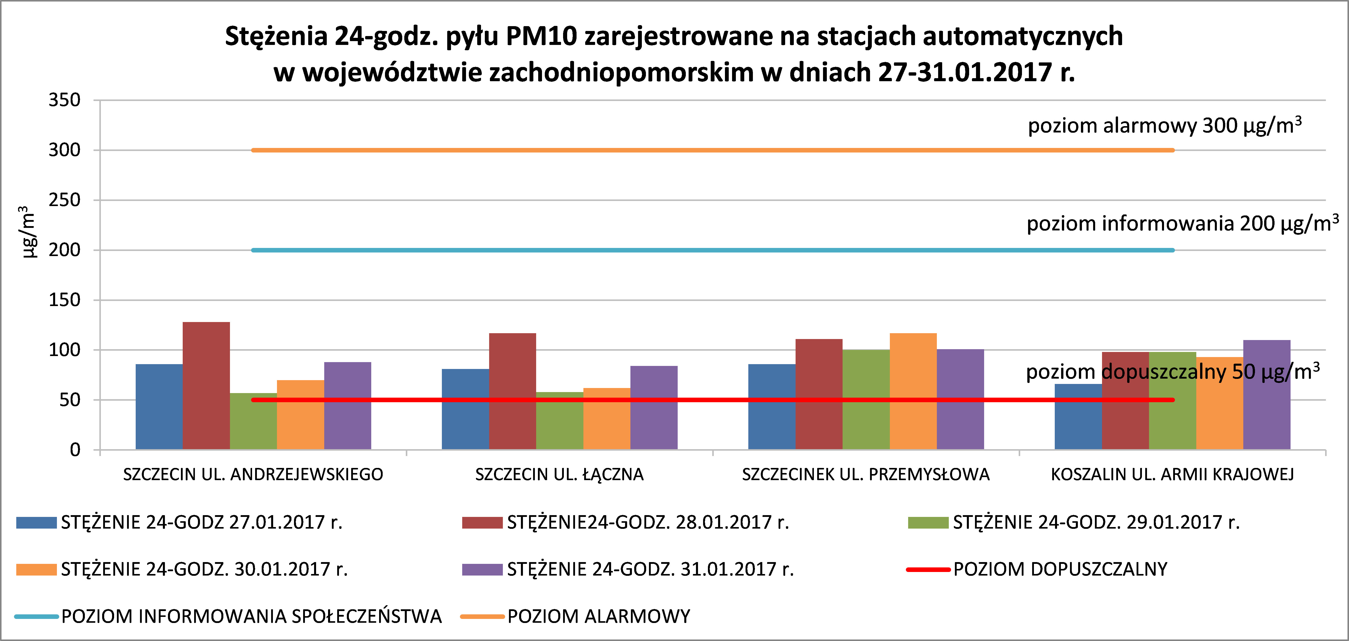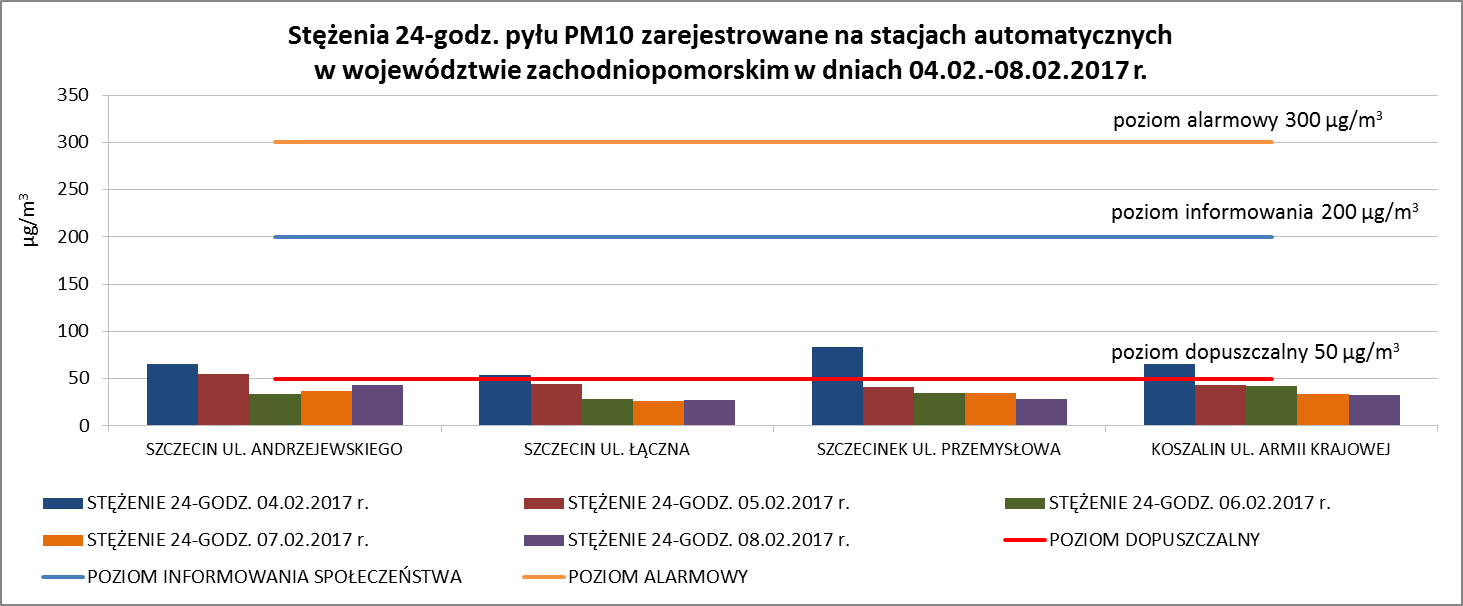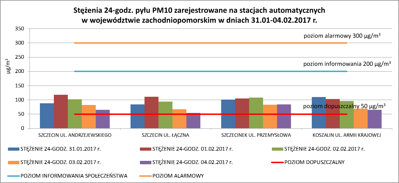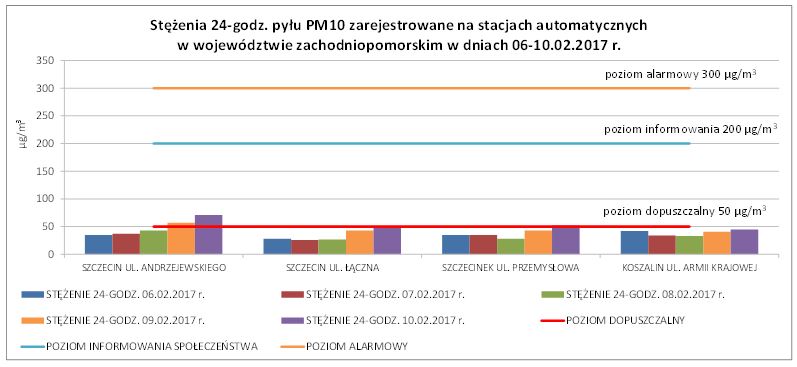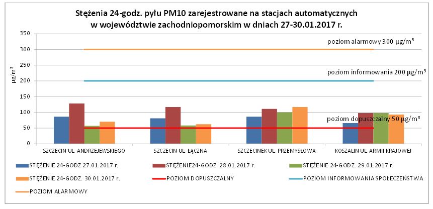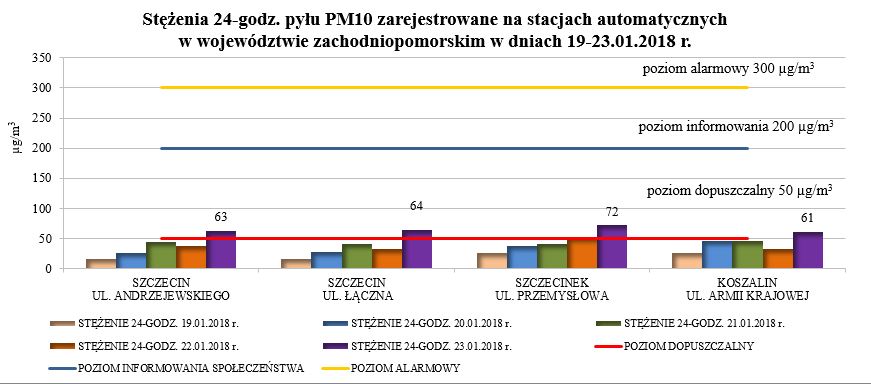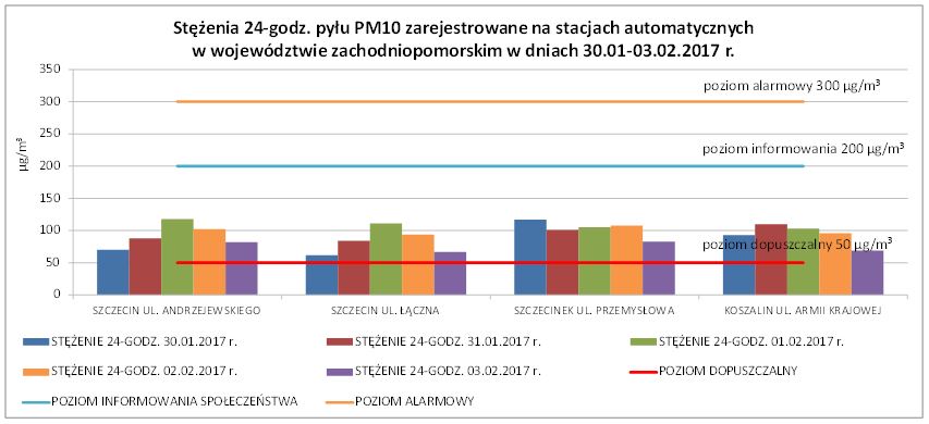 Wojewódzki Inspektorat Ochrony Środowiska w Szczecinie informuje o wynikach pomiarów 24-godzinych stężeń pyłu zawieszonego PM10, wykonanych w miesiącu styczniu 2010 r. na ośmiu stanowiskach pomiarowych zlokalizowanych w czterech strefach województwa zachodniopomorskiego (Aglomeracja Szczecińska, miasto Koszalin, powiat gryfiński oraz powiat szczecinecki).