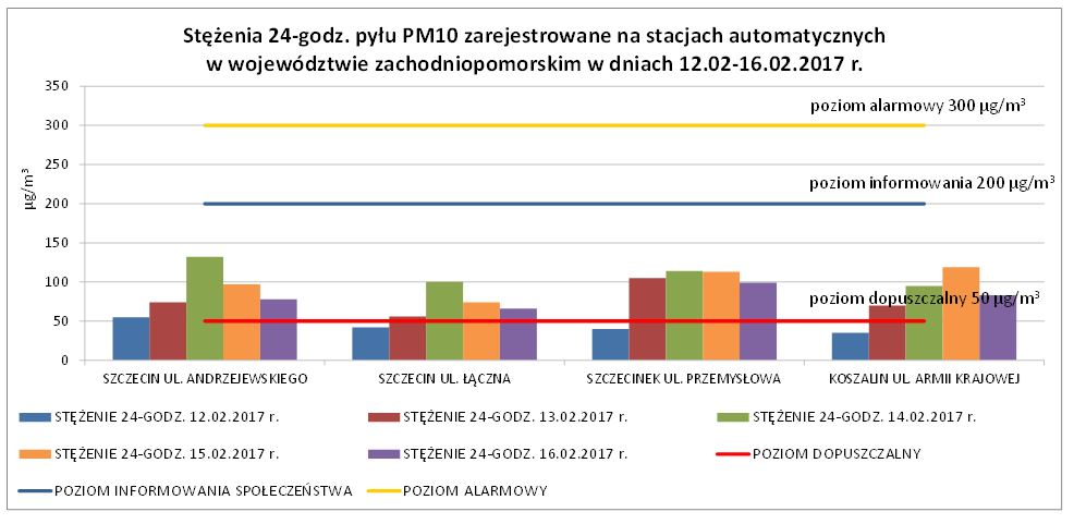 Wojewódzki Inspektorat Ochrony Środowiska w Szczecinie informuje, że powiadomił Wydział Bezpieczeństwa i Zarządzania Kryzysowego Zachodniopomorskiego Urzędu Wojewódzkiego w Szczecinie i Zarząd Województwa Zachodniopomorskiego o wystąpieniu w lutym b. r. ryzyka przekroczenia w roku 2016 standardu jakości powietrza przez 24-godzinne stężenia pyłu PM10 na jednym obszarze strefy zachodniopomorskiej – w mieście Myślibórz.