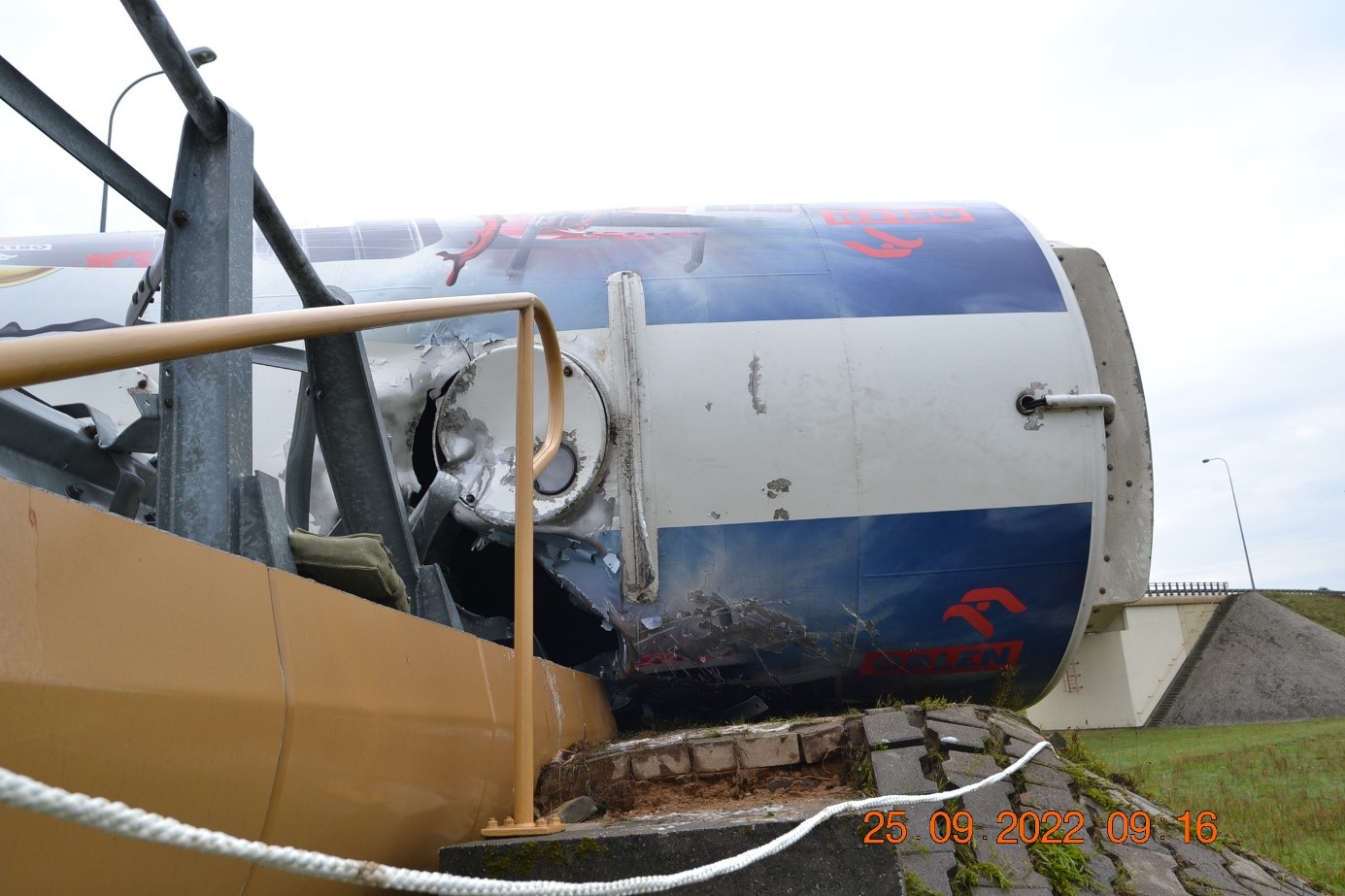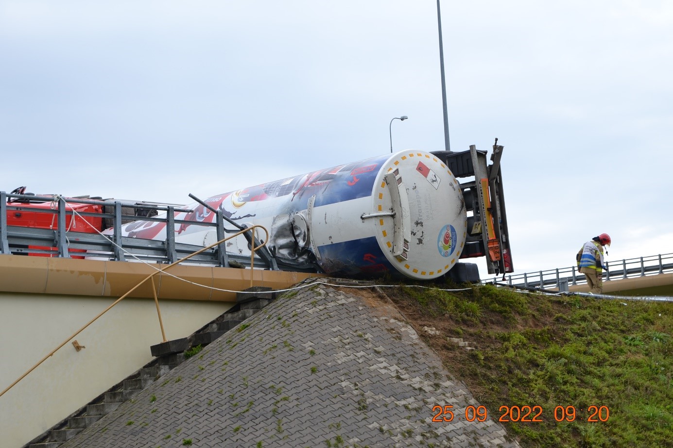 Na miejscu Inspektorzy stwierdzili, że przewróceniu na bok na estakadzie uległ ciągnik siodłowy z naczepą – cysterną z logo Orlen. Według początkowych szacunków wyciekowi uległo 12 m3 oleju napędowego wskutek rozerwania jednej komory cysterny. Po około godzinie uzyskano informację o uszkodzeniu wszystkich komór cysterny i wycieku ponad 36 000 l oleju napędowego i benzyn. Z cysterny wypompowano 700 l substancji.