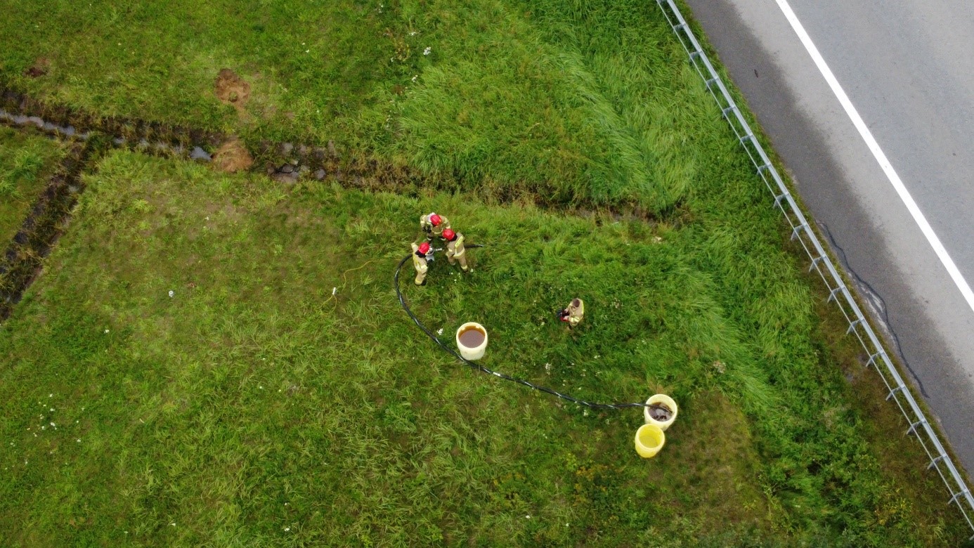 Substancja wyciekająca z cysterny spłynęła do rowu w pasie drogowym. Inspektorzy sprawdzili okoliczny teren pod kątem występowania cieków wodnych i możliwości ich zanieczyszczenia substancjami ropopochodnymi. Podczas oględzin nie stwierdzono wód powierzchniowych w okolicy wypadku. Wykonano dokumentację fotograficzną, w tym z wykorzystaniem bezzałogowego statku powietrznego.