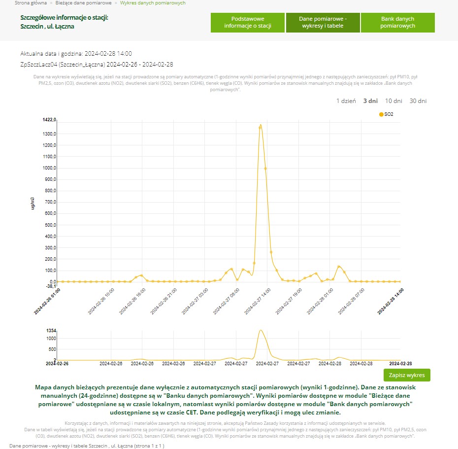 We wtorek 27 lutego br. o godz. 13.53 Regionalny Wydział Monitoringu Środowiska w Szczecinie Departament Monitoringu Środowiska GIOŚ przesłał powiadomienie o ryzyku wystąpienia przekroczenia poziomu alarmowego dwutlenku siarki SO2 w powietrzu na terenie Szczecina. Tym samym zadziałała procedura zgodna art. 94 ust. 1b i 1c ustawy Prawo ochrony środowiska (t.j. Dz.U. z 2024 r., poz. 54) oraz rozporządzeniem Ministra Środowiska z dnia 24 sierpnia 2012 r. w sprawie poziomów niektórych substancji w powietrzu (t.j. Dz. U. z 2021 r. poz. 845).