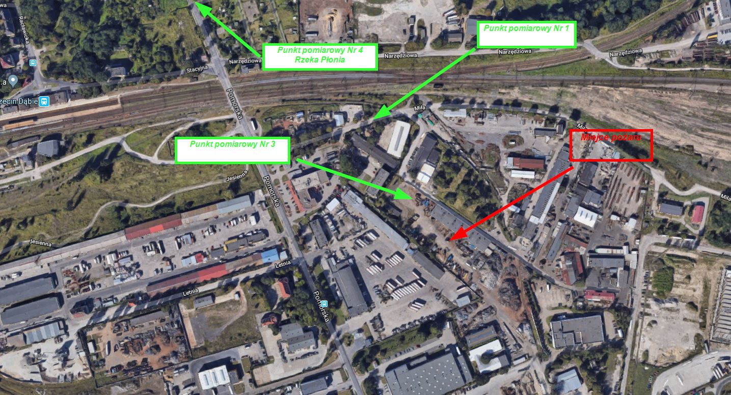 Podczas akcji gaszenia pożaru na terenie zakładu obecni byli pracownicy Wojewódzkiego Inspektoratu Ochrony Środowiska, którzy dokonywali dodatkowych pomiarów stężeń substancji przy pomocy sprzętu mobilnego w następujących punktach.