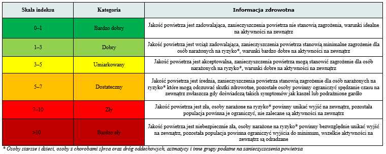 W dniu 04.02.2017 r. indeks ten dla pyłu PM10 w Szczecinie i Koszalinie przez większość dnia utrzymywał się na poziomie „stan dobry” i „stan umiarkowany”, w Szczecinku – „stan umiarkowany”. Natomiast indeks dla pyłu PM2,5 w Szczecinie utrzymywał się na poziomie „stan umiarkowany” i „stan dostateczny”. Z kategorią indeksu jakości powietrza powiązana jest informacja dotycząca skutków zdrowotnych oraz narażenia wrażliwych grup społeczeństwa – tabela załączona poniżej.