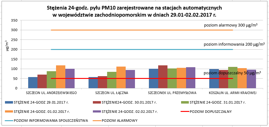 W dniach 29.01.-02.02.2017 r. w naszym województwie zarejestrowano przekroczenia poziomu dopuszczalnego przez stężenia dobowe pyłu PM10 na wszystkich stanowiskach pomiarów automatycznych (Szczecin, ul. Andrzejewskiego i ul. Łączna, Szczecinek – ul. Przemysłowa, Koszalin – ul. Armii Krajowej - wykres 1).