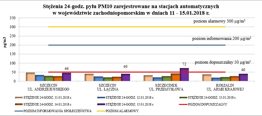 W dniu 15.01.2018 r. wystąpiło przekroczenie wartości dopuszczalnej stężeń 24-godzinnych pyłu PM10 na stanowisku pomiarowym w Szczecinku przy ul. Przemysłowej. W dniach od 11.01.2018 r. do 14.01.2018 r. nie odnotowano przekroczeń wartości dopuszczalnej na żadnym stanowisku w województwie zachodniopomorskim – wykres 1.